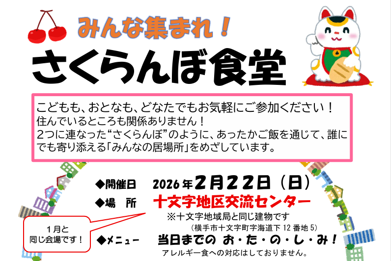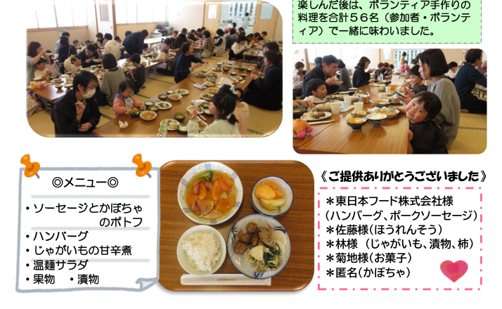 当日までの お・た・の・し・み! ※アレルギー食への対応はしておりません。 ※こども無料、大人200円(協力金・任意) 参加希望の方は、2月17日(火)午後3時までに下記へご連絡ください。