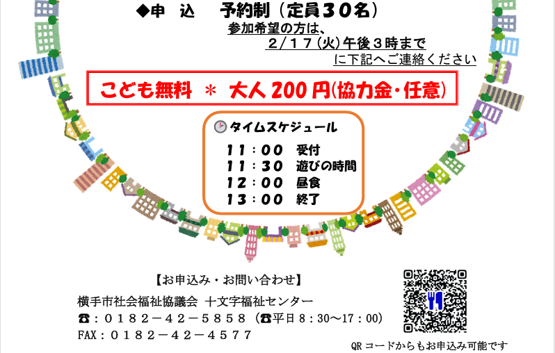 ◇参加申し込み・問い合わせ先◇ 横手市社会福祉協議会 十文字福祉センター(平日8:30~17:00) 電話:0182-42-5858 FAX:0182-42-4577 ※チラシに記載のQRコードからもお申し込みいただけます。 ※定員になりましたら、受付を終了する場合があります。