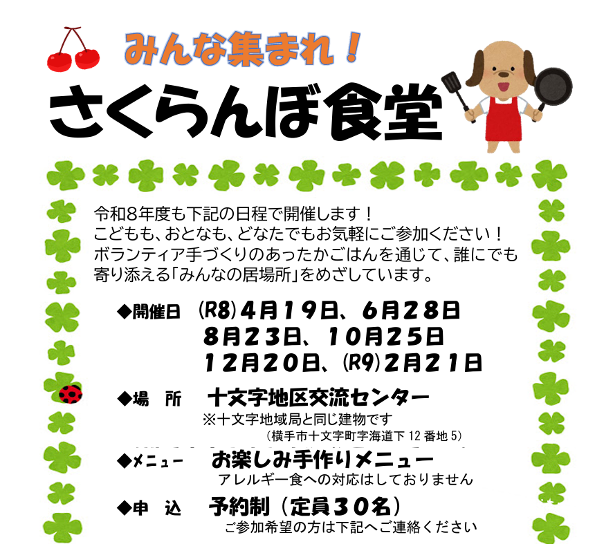 ※たくさんのお問い合わせをいただきありがとうございます。4月19日(日)予定しております「さくらんぼ食堂」につきましては、定員に達したため募集を締め切らせていただきました。開 催 日 :4月19日(日) 午前11時~午後1時