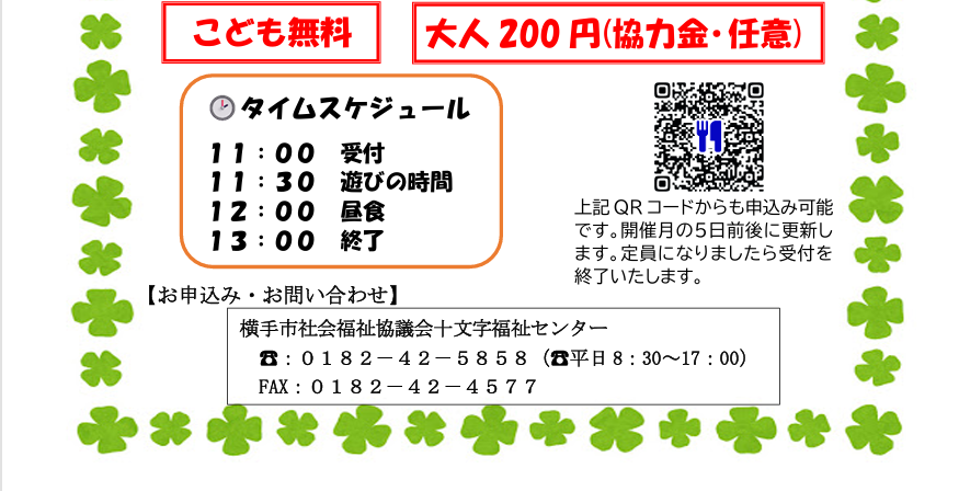 ◇参加申し込み・問い合わせ先◇ 横手市社会福祉協議会 十文字福祉センター(平日8:30~17:00) 電話:0182-42-5858 FAX:0182-42-4577 ※チラシに記載のQRコードからもお申し込みいただけます。 ※定員になりましたら、受付を終了する場合があります。